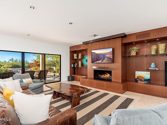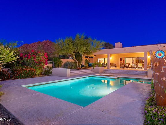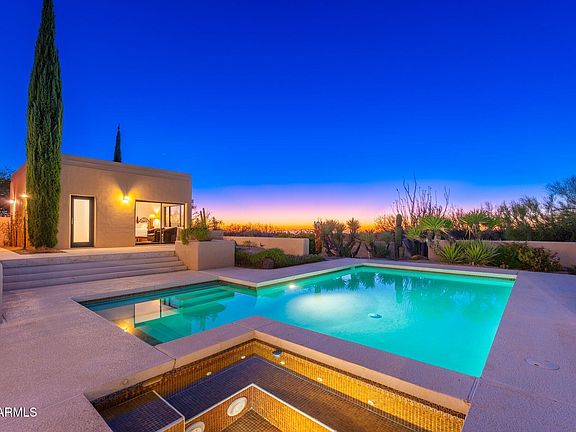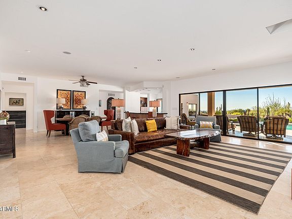 Breathtaking views of Pinnacle Peak, the valley, and city lights set the stage for this stunning home, nestled on just over an acre of mature desert landscape. Freshly painted throughout with all new switches and cover plates, this three bedroom plus office and three and a half bathroom home is a blank canvas ready for its new owner. The main house spans 2,791 square feet of single-level living, featuring two bedrooms, plus an office that could serve as a fourth bedroom, and two-and-a-half bathrooms. The thoughtful split floor plan provides privacy, while the detached 460 square foot guest house, with its own private entry, offers a bedroom, full bath, classic kiva fireplace, sitting area, and kitchenette. The main home welcomes you with an open great room, where an oversized sliding glass door fills the space with natural light and offers seamless views of the backyard. A modern fireplace with a custom wood surround and display shelving adds warmth to the room. Extending from the home is a spacious travertine patio, offering plenty of room for outdoor dining and lounging, all while overlooking the pool, spa, and barbecue areaperfect for entertaining.