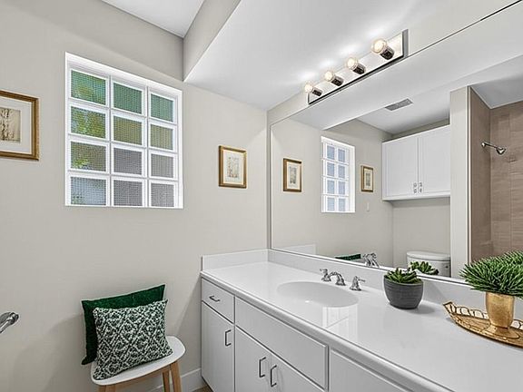 Stainless refrigerator and dishwasherWood floorsLow-maintenance settingGlass-block windowsIsland gas cooktopBright second-floor livingDual vanity