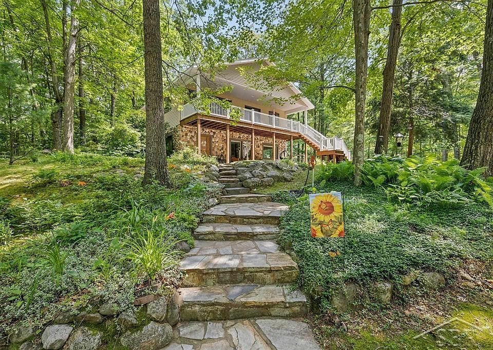 Nestled in the woods of this 20 acres, this hidden gem offers unmatched privacy that sets the tone for peaceful living. Surrounded by rolling hills and an abundance of wildlife such as deer, birds, and more. This property is a nature lover’s dream. Inside, you'll find a warm and inviting main level with a pellet stove, while the walk-out lower level features a wood stove, two walls of floor to ceiling windows, and its own full kitchen, perfect as a prep space for your gathering. New appliances and abundant windows throughout elevate both function and charm. The spacious primary bedroom includes an attached full bath for your comfort. Relax and unwind on the amazing covered deck ideal for enjoying the peaceful views in any season. A truly special retreat offering space, seclusion, and scenic beauty.