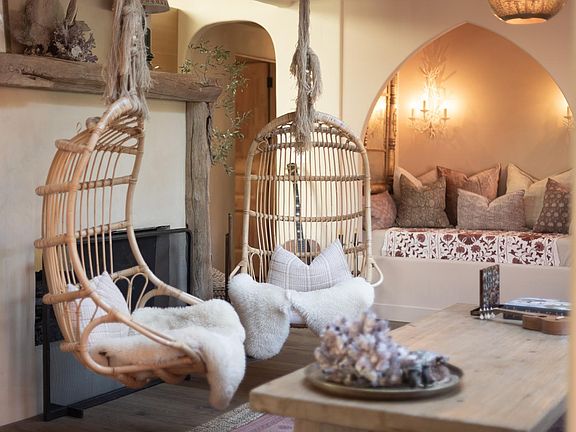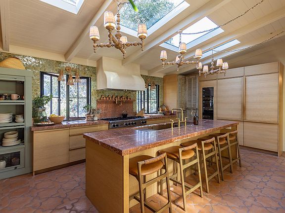 Venetian-plaster fireplaceSurrounded by orchardsMature oaksOverlooks the valleyCustom white oak cabinetryOpen spacesSix-foot copper farmhouse sink