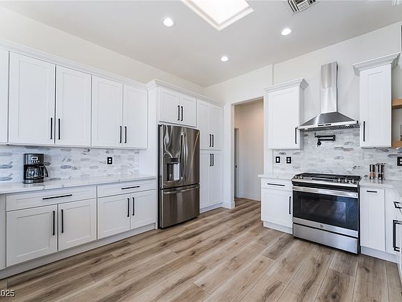 Welcome to your desert oasis in the heart of Sun City Summerlin! Perfect for snowbirds or those seeking a peaceful full-time residence, this fully remodeled & move-in ready home blends elegance, comfort, & modern design. Step inside to discover new fresh interior paint, custom white shaker cabinets, quartz countertops, luxury vinyl plank flooring, plush carpet in the bedrooms, tall 5.5” baseboards, stainless steel appliances, & stylish contemporary fixtures throughout. The open-concept layout is ideal for entertaining or relaxing after a day on the golf course or at one of the community’s many recreation centers. The spacious primary suite offers a private retreat w/a spa-inspired bathroom featuring a freestanding soaking tub, large step-in shower, & its own cozy fireplace. Enjoy the Las Vegas sunshine from your beautifully landscaped yard, just minutes from premier golf, dining, shopping, & entertainment. Live the resort lifestyle you’ve dreamed of—welcome home to Sun City Summerlin!