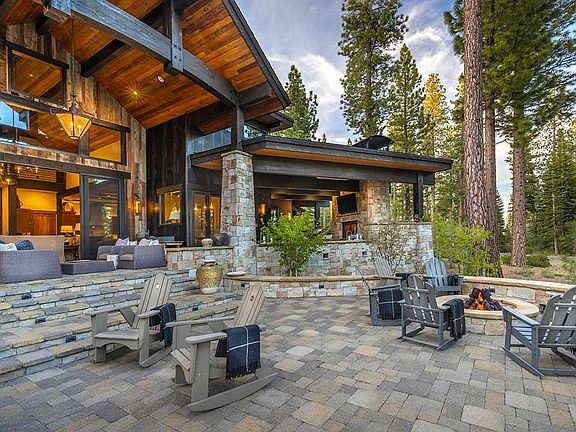 Every element of this Martis Camp home contributes to its propensity to entertain, whether it’s just you and the family or a gathering of dozens who find time to connect in places like the theater, the upstairs billiards room and bar, the intimate nook by the fireplace, or the expansive patio with impressive views of Lookout Mountain. Eyes widen the moment one sets foot into this 5,131 square foot, 4 bedroom, 4.5 Bathroom home, beholding a great room with soaring ceilings, a stone fireplace, and windows framing that mountain known as Lookout. Overlooking this scene is a stunning walkway connecting the upstairs bedrooms to the media room with its own deck gazing off to the slopes and Sawtooth. The kitchen, where every late-night get-together eventually convenes, features a spacious granite workspace, as well as a handsome wood counter with seating. Nearby is a dining room that’s adjacent to a theater. The dining room doors open to a expansive patio with covered/heated dining, a barbecue bay, sink and mini bar, an open plaza with pizza oven, a firepit and seating, a large swing chair, and a covered, ground-level hot tub with big screen tv and even bigger views of the mountains. Accessing this hot tub wing of the patio is the primary suite with stone fireplace, reading area, jacuzzi, and a nearby office. There’s another nearby bedroom while a stout, handsome staircase climbs to a landing and a billiards room with bar, big screen tv, deck, and bedroom with loft and views. Across the bridge overlooking the living space is a junior suite with its own lounge/media room and bar. Beyond this home are entertaining options that run the length of the community, leading to the 18-hole Championship Golf Course, the Camp Lodge, Family Barn, a string of grassy parks, miles of trails, a putting course, and all the other attractions that led Links Magazine to claim that, “Only one thing is more beautiful than visiting Martis Camp, and that is living there.”