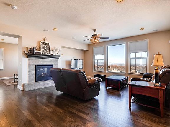 Upgrades galore, backing to open space with mountain and city views! Designer tile entry, hardwood floors on entire main. Designer kitchen with high-end stainless appliances, dual ovens, warming drawer, gas cooktop, walk-in pantry, slab granite, plus additional cabinets and sink. Great room has a two-sided gas fireplace adjacent to study/library and formal dining room. Main floor guest bedroom with 3/4 bath, plus another half bath on main. Expanded covered deck with views, TV & gas hookups. Upstairs master suite with retreat, fireplace and panoramic views of the mountains and city. 5 piece bath with frameless shower door and dual shower heads. Two more beds, two more baths, & laundry also upstairs. Full unfinished walk-out basement w/ 10' ceilings ready for your design. Back yard has stone patio with firepit and water feature. Additional upgrades include wrought iron rails, upgraded fixtures, dusk to dawn lighting, electrical & lighting upgrades throughout. Must see!
