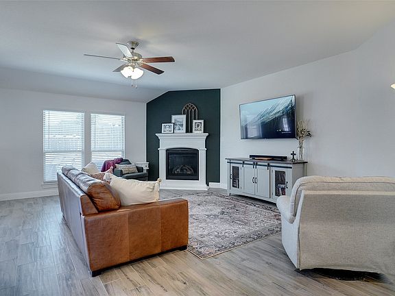 Accent fireplace wallPrivate backyardStone accent frontExtensive lvp floorsSpacious master suiteWhite quartz breakfast barAmple countertops