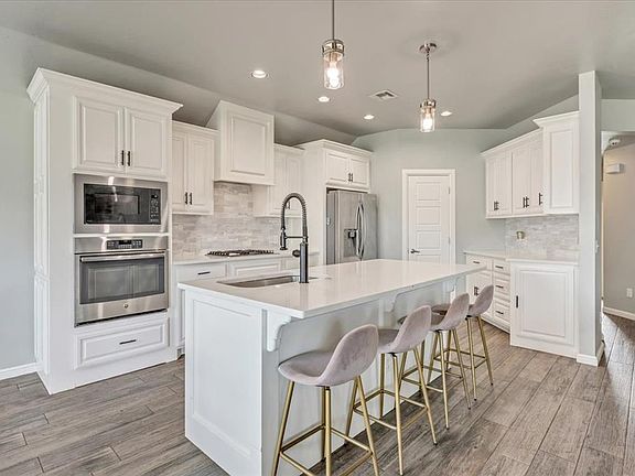 Step into a light-filled, airy interior where wood-look tile flows throughout the main living spaces. The open-concept layout connects the spacious living area to a beautiful kitchen with quartz countertops, crisp white cabinetry, gas cooktop, built-in oven and microwave, and an oversized island that easily becomes the heart of the home. A cozy dining nook offers the perfect spot for everyday meals without sacrificing space or flow.