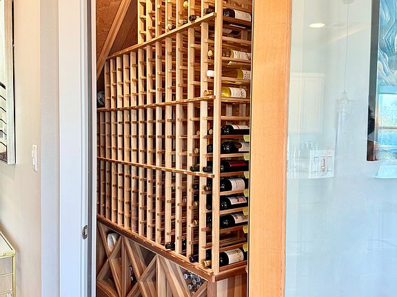 Lavish appointments include custom-built wine storage and a striking stone accent wall in the living room. Walls of windows throughout the open living, dining, and kitchen areas flood the space with natural light and showcase the picturesque surroundings. The spacious dining and gourmet kitchen are ideal for entertaining, featuring quartz countertops, crisp white cabinetry, stainless steel appliances, a large center island with bar seating, and elegant pendant lighting.