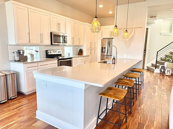 The main-level primary suite offers a luxurious escape, complete with dual vanity sinks, a walk-in shower, a large walk-in closet with built-in shelving, and direct access to the laundry room for added convenience. Upstairs, you'll find a versatile flex space along with two additional bedrooms and a full bath perfect for a home office, playroom, or guest accommodations.