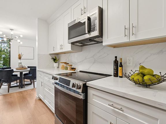 Corner-unit condoPrivate balconyGourmet kitchenModern designOverlooks peaceful courtyard viewsSleek wide-plank flooringNew quartz countertops