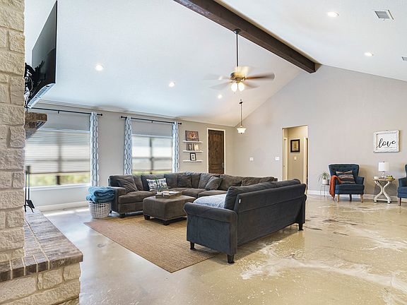 Inside, you'll find stained and sealed concrete floors throughout for easy upkeep, and an open floor plan centered around a cozy wood-burning fireplace. The large kitchen is both functional and stylish, featuring granite countertops, stainless steel appliances, and abundant cabinet space. The primary suite serves as a true retreat with a spacious walk-in closet and a luxurious oversized shower with dual shower heads.