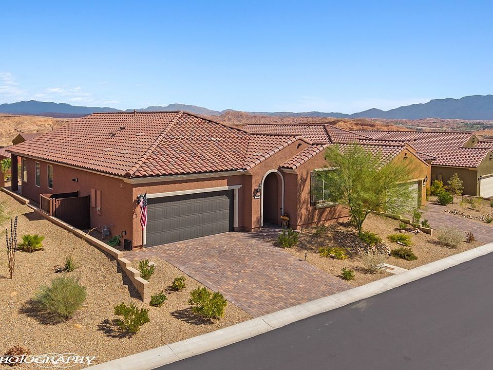 Exquisite Home with mountain/fairway views in Sun City. Experience living in this magnificent Sun City Mesquite home, perfectly situated on a premium view lot. Enjoy picturesque mountain and mesa views from your back patio or from your serene backyard. This spacious 2-bed, 2-bath home includes a large den for hobbies or relaxation. The gorgeous kitchen is the heart of the home, featuring upgraded cabinetry, sleek quartz countertops, a beautiful backsplash, and a truly incredible custom pantry. The main suite is a private retreat, with a bay window that frames the stunning vistas. The large walk-in closet has been upgraded with custom cabinetry, offering exceptional organization. The main bathroom is a luxurious space with beautiful tile and quartz countertops. The home features 8' tall doors throughout and a glass wall slider in the living room, seamlessly connecting indoor and outdoor living. The backyard is an outdoor haven with an extended paver patio and a fully fenced yard. The home also features a dedicated laundry room with a sink and cabinets for convenience. This property is a perfect blend of luxury and practical design, with too many custom features to list. Live the life you deserve in this exquisite 55+ community.