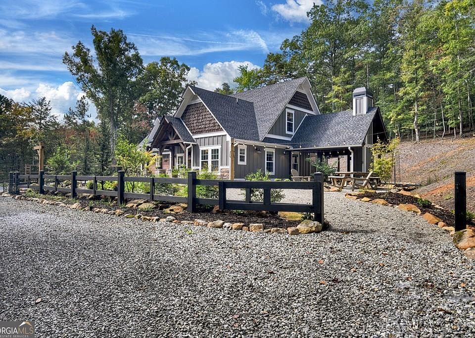 Discover this beautiful low-maintenance home featuring durable Hardie board siding & an inviting layout perfect for comfortable mountain living. Offering 4 BR, 2.5 BA, this property combines modern finishes with serene privacy near the end of a quiet, county-maintained gravel road-just minutes from Hwy 515 for easy access. The main level boasts an open-concept kitchen with granite countertops, stainless steel appliances, and a spacious great room complete with a fireplace and gas logs. The primary suite is conveniently located on the main level and features a custom bath, while the large laundry room, oversized pantry, and an additional guest room or office add everyday convenience. Upstairs you'll find two bedrooms with a shared bath, a large loft area ideal for a sitting room or play space, and a versatile bonus room above the garage-accessible by a separate entrance-offers endless possibilities for a studio, home office, or guest suite. Outdoor living is a highlight with a cozy patio and wood-burning fireplace, firepit area with picnic table, raised flower beds, fenced garden area, and a reliable artesian well. The oversized 2-car garage includes a workshop area, and there's an additional detached 2-car carport for extra parking or storage. Stepless entry into the main level ensures easy accessibility throughout. Private, peaceful, and move-in ready!