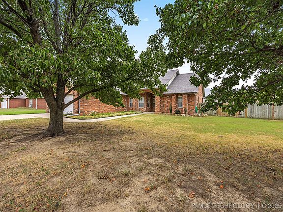Step inside to an inviting open floorplan designed for both everyday living and entertaining. The kitchen features concrete countertops, abundant storage, generous counter space, and an island with cooktop and downdraft vent, plus a brand-new gas stove. The living room centers around a cozy wood-burning fireplace, while the formal dining area can easily serve as an office or playroom. Elegant trayed ceilings, ceiling fans, and faux wood blinds add extra style throughout.The primary suite offers private access to the extended covered patio and an en suite bath with a whirlpool tub, dual sinks, and separate shower. In the backyard, enjoy an amazing full-length covered patio across the back of the home, perfect for gatherings or quiet evenings. Oversized lot! Located in the Morrow Elementary School district, just minutes from Funtastic Island Park, Owasso Sports Complex, shopping, and restaurants. Don't miss this!