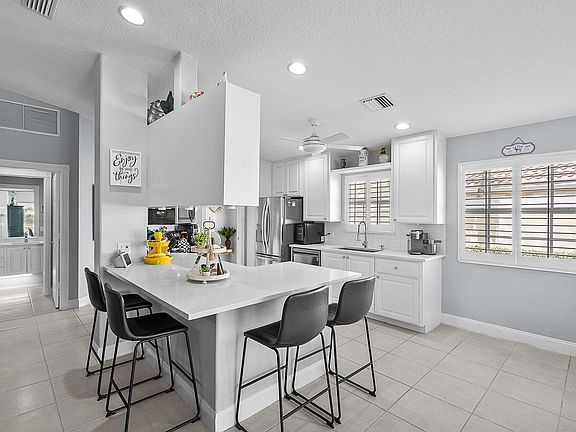 Immaculate villa with a heated, screened-in pool & preserve view. Over $30K in recent upgrades: hot tub (2024), quartz kitchen & bath countertops w/ new sinks & custom faucets (2023), S/S appliances & washer/dryer (2023), epoxy garage flooring (2023), laminate flooring in bedroom & family room (2023), interior paint (2023), updated ceiling fans & lighting (2023). Additional updates pool heater (2022), A/C (2021), hot water tank (2021), plus roof & driveway recently cleaned. Gated community w/ 24-hr manned security & resort-style amenities: 2 heated pools, tennis, pickleball, basketball, bocce, shuffleboard, fitness center, clubhouse & playground. HOA covers cable, internet, alarm monitoring, lawn care & exterior painting. Just a golf cart ride to Tradition shops & dining, close to I-95. Plantation shutters throughout, knockdown ceilings throughout with some recessed lighting, neutral 17" tile flooring, solid concrete poured walls, paver brick driveway and the pool was recently acid washed. Morning sunrise views. HOA is scheduled to paint the exterior a neutral color very soon at the HOA's expense. The immaculate and ready to move in villa will truly not last!