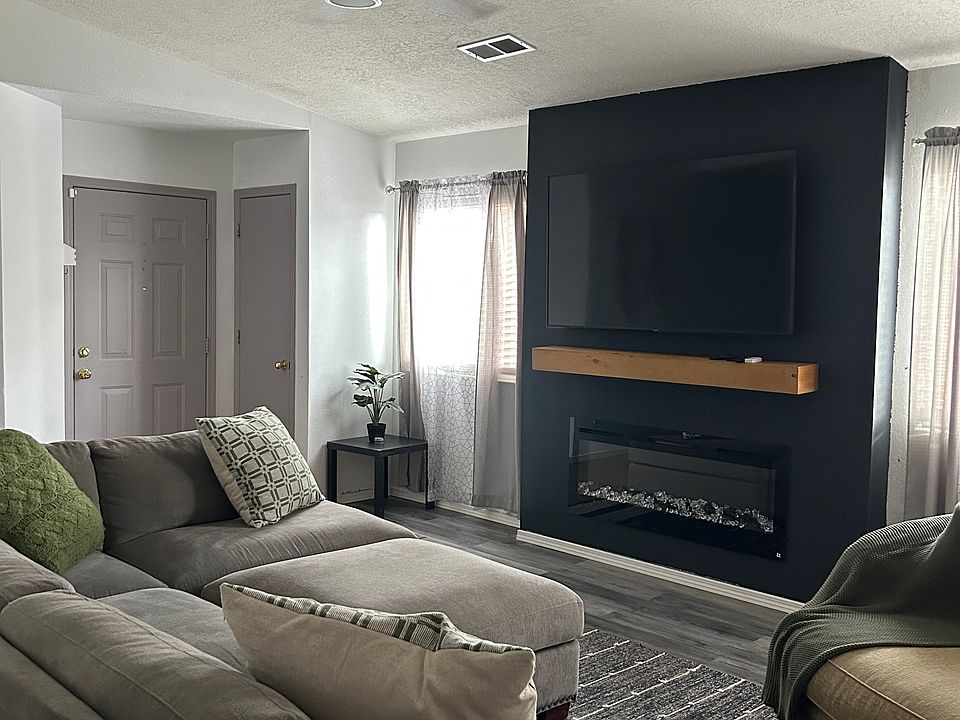 The cozy living room with an electric fireplace offers a warm and inviting space to relax. In the kitchen, you'll enjoy a walk-in pantry for extra storage and new amenities, including updated fixtures and appliances. The garage also includes a refrigerator, giving you even more space for groceries, beverages, or meal prep overflow.