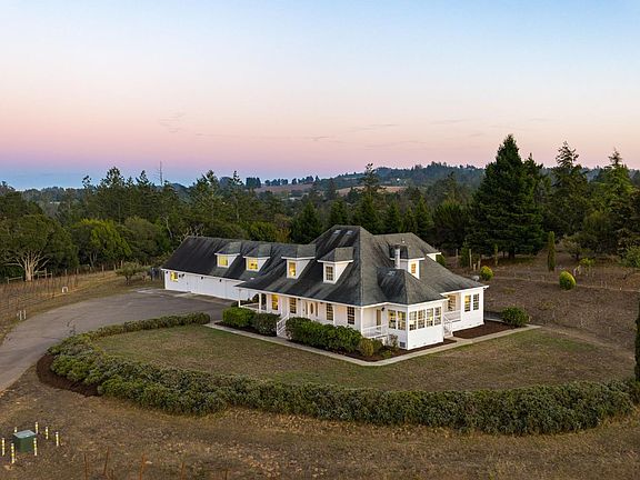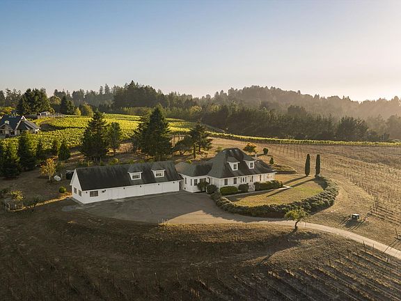 This exceptional 13-acre property showcases breathtaking views of Sebastopol's rolling hills, world-renowned vineyards, and the distant Mayacamas Mountains. Upon entering the stately residence, you're greeted by a charming covered front porch, rich hardwood floors, and a grand staircase that immediately conveys timeless character. With over 3,500 square feet of living space, this refreshed home provides an ideal canvas for you to bring your one of a kind estate vision to life. The main level features an expansive primary suite, multiple living areas, and two additional rooms. Upstairs, three bedrooms and two full bathrooms offer generous accommodations for family and guests. An attached three-bay garage and workshop, encompassing approximately 1,700 square feet, delivers abundant storage and workspace. While currently unplanted, the property is regarded as an ultra-premium viticultural site. With 10 +/- acres already staked and supported by significant vineyard infrastructure, it presents a unique opportunity for those ready to cultivate a truly distinguished estate vineyard. Balancing serenity with convenience, this property is just 5 miles from Sebastopol city limits and 13 miles from the Sonoma Coast.