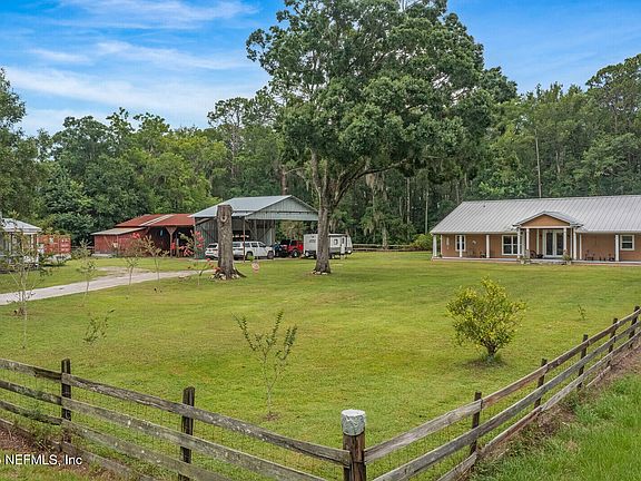 PRICED BELOW APPRAISED VALUE WITH NO HOA OR CDD FEES! Instant equity on over 2 acres of serenity featuring 1.28 acres fenced plus a private 0.80-acre driveway. Custom-built in 2019, this 3BR/2.5BA home offers 2,227 sq ft of living space with tile flooring throughout and a durable tin roof. Enjoy lake views from the front porch or unwind on the screened back porch by the gas log stove. Property includes a 4,200 sq ft concreted pole barn with 2 enclosed workshops, 2 RV hookups, and an extra 1,100 sq ft structure for endless possibilities. Peaceful country living in the heart of St. Johns County—bring your dreams and make this your homestead today!