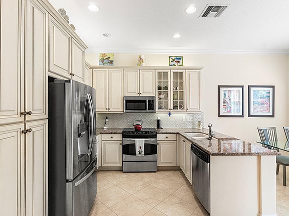 Beautifully landscaped, meticulously maintained, light and bright 2 bedroom + den/2 bath home with a 2 car garage! The decorative paver driveway and walkway, rock garden and colorful flowers will greet you. On entry, take in the neutral tile on the diagonal, crown mouldings, and light and airy paint throughout. The great room is spacious, and is open to both the dining room and the kitchen. The eat-in kitchen offers wood 42'' cabinets in a Bisque finish w/grey glaze, large pantry, granite countertops with a mosaic glass tile back splash and top of the line stainless steel appliances. There is a formal dining room for entertaining. Lots of natural light, LED hi hat lighting and LED light fixtures add to this home's appeal. The primary suite offers garden views, closet built ins, and dual closets w/mirrored doors. The master bath features include a large glass door shower, dual sinks in a granite vanity, and separate water closet. This home has a great split bedroom plan, with a spacious guest bedroom and large closet, and a den/3rd possible bedroom (no closet) with plantation shutters and double pocket doors. The fully covered, screened patio is a peaceful and tranquil place with garden views to enjoy your morning coffee or tea, or dine al fresco while enjoying the gorgeous Florida weather! There is a great phantom screen on the front door so you can enjoy beautiful cross breezes while patio doors are open! Valencia Pointe is full of social opportunities thanks to the amazing social director, from the countless clubs and events, to the recently renovated clubhouse complete with resort style pools, cafe, fitness center, card rooms, theatre, arts and crafts studio, billiards room, pickleball, tennis, and so much more! Welcome HOME!