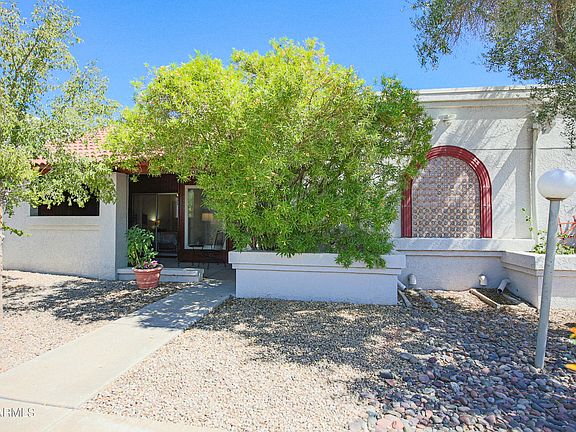 Charming property nestled in the Country Meadows Community boasting with pride in ownership. Upon arrival, you'll be greeted by a cozy front porch w/security screen door and storage area. Bright open floor plan showcasing 2 Bedroom Ensuite! Both bedrooms are well-appointed, each having its own bathroom for comfort and privacy! One includes a walk-in closet & sliding doors to the patio, and the other features two closets with new flooring in the bathroom. Home has recently received new interior paint & new outlets and switches. Good-size kitchen with eat-in area and a skylight! Indoor laundry! Secure, gated complex with no stairs, only single level homes. CLOSE TO STATE FARM STADIUM/WESTGATE CENTER AND ONLY 5 MINUTES FROM LOOP 101, restaurants, golf courses and top golf, parks and more!