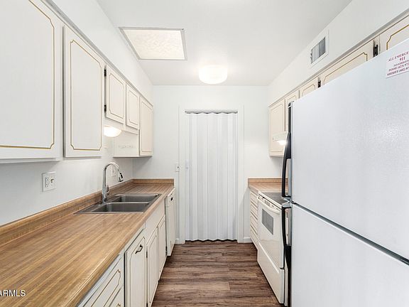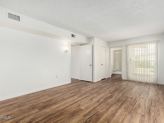 TURN KEY 2-bed, 2-bath garden home in the heart of Sun City. Includes private backyard and garage with cabinets. Living in the coveted and historic Sun City with the convenience of this well cared for home and the 8 recreation centers a short golf cart ride away. Recent upgrades: AC 2019, Water heater 2024, roof 2021. Recently installed luxury plank vinyl flooring throughout. Spacious living room and formal dining area open to a bonus multi-use room. The large master suite features a walk-in closet, walk-in shower and space for a sitting area or desk. The second bedroom also offers a walk-in closet. The kitchen includes a smooth top electric stove, refrigerator and dishwasher. Custom enclosed laundry area with bonus storage. Garage cabinets. Low payment leased solar.