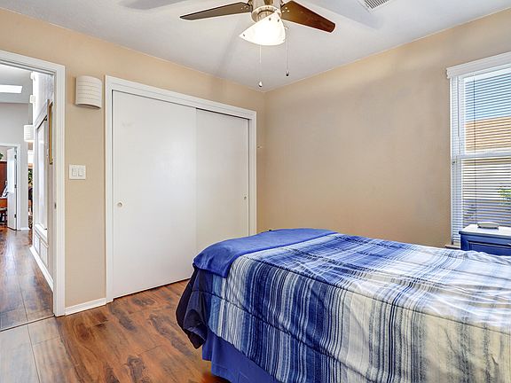 Beautiful Well Maintained home in the quiet green community of Towne Park. 3 bedrooms, 2 baths, 1451 sq ft of living space. Low maintenance back yard and covered patio. Upgrades over the years include painting the kitchen cabinets and adding new hardware, gas was connected to the dryer and stove, laminate flooring throughout, water heater in 2016, roof in 2021 and refrigerated air and furnace in 2022. All appliances stay. Skylights throughout. Kiva style gas fireplace. Land is Owned, no lease. HOA is $132 per month and covers front yard maintenance, streets, 2 pools, 2 parks, clubhouse, workout room, tennis courts, privacy gates, trash removal and more. Located close to shopping, restaurants, KAFB, Sandia Labs and access to I-40. Don't miss this beautiful home in this great community.