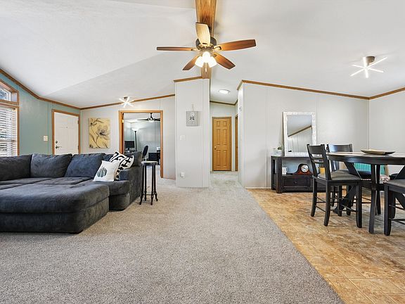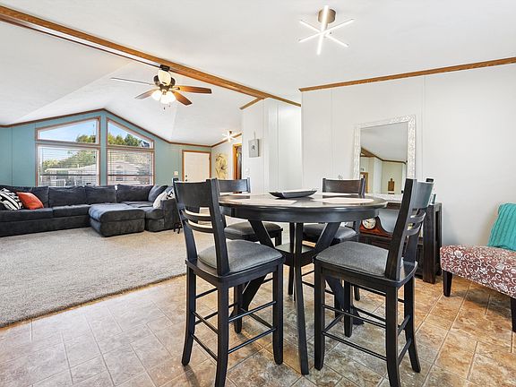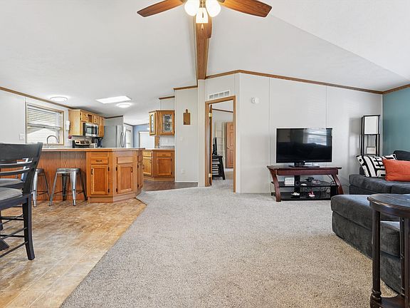 Well-kept 3-bedroom, 2-bath home with oversized garage, breezeway, large driveway & ramp to front deck. Inside the vaulted ceilings & skylights give a lot of natural light. The spacious kitchen offers abundant cabinets, lots of countertop space, bar seating & dining area. Theres also room for a breakfast nook or drop zone off the garage entry. One bedroom has French doors & is located off the living room making for a great office or flex space. The monthly lot rent $772/ month 2025-09-30