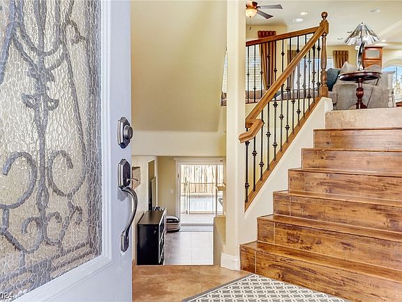 Price Correction!! Experience luxury living in this 3-story haven, boasting 5 bedrooms, 3.5 baths, and an incredible community. Dive into the brand-new pool with a brand-new bamboo wall, complemented by solar panels for cost-efficient utilities. Dual master bedrooms feature upgraded baths and walk-in closets, while the balcony offers new wood flooring. Inside, enjoy ceramic tile and wood laminate floors, a spacious layout, and a gourmet kitchen with granite countertops, an enormous island, and stainless-steel appliances. Plus, a tankless water heater and water softener add convenience. Cozy up by the electric fireplace, with all flat-screen TVs included. Convenience meets luxury with nearby amenities including restaurants, shopping centers, Costco, hospitals, and even the Raiders practice facility. Don't miss out on this absolute must-see!