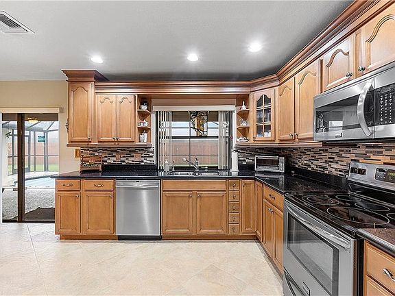 Beautifully Updated 4 BR/2 BA Home with Screened Pool & Fenced Back Yard! New Primary Bath 2022 & Guest Bathroom 2023. Kitchen Updated, 2017, with Custom Wood Cabinetry, Granite Countertops, Glass Tile Backsplash & SS Appliances. Cabinets offer Lazy Susan, Soft Close Drawers & Deep Pantry with Pull Out Shelves. Neutral Tile installed 2017 throughout Living Area & New LVP Floors in Bedrooms 2023. Open & Flexible Floor Plan with Vaulted Ceilings. Split Stack Bedroom Plan. Wood Burning Fireplace. Interior Laundry Room includes Washer/Dryer & Cabinets/Shelves for extra Storage. Laundry Room w/door opens to side yard. Accordion Hurricane Shutters except panels for pass through window in Kitchen. Spacious Covered Patio w/Cool Deck. Screen Pool w/Diamond Brite finish. Walk to Cypress Park.