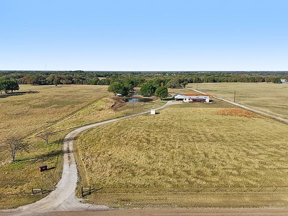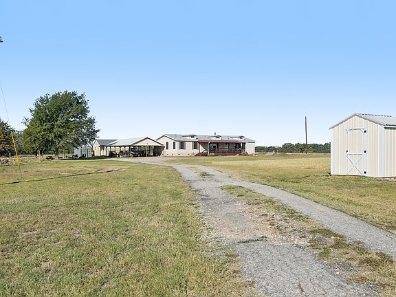 Spacious double-wide on nearly 20 acres featuring an open living, kitchen, and dining layout with a wood stove. Kitchen offers an island, glass cooktop, oven, microwave, and large walk-in pantry. Private split master suite includes a huge walk-in closet with bathroom access, dual vanities, jacuzzi tub, and separate shower. Additional bedrooms include a bunk-room style room with walk-in closet and a generous guest bedroom, plus a hall bath with tub-shower. Separate laundry room with space for full-size fridge or freezer and deck access. Enjoy the 30x10 covered decks on both the front and back, a fenced backyard with privacy fence, storm shelter, and whole-house propane generator. Property also includes upgraded underground electric, aerobic septic system, and a newer HVAC (approx. 3 years old).