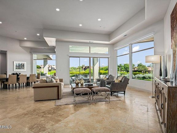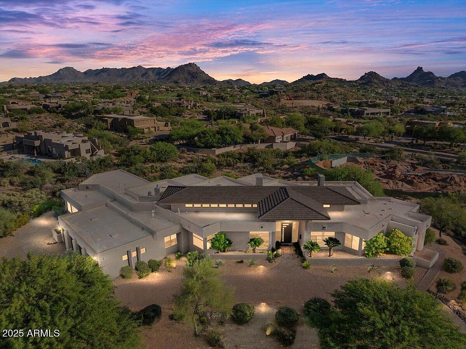 Perched on an elevated 1.3-acre lot with sweeping views of Pinnacle Peak, this fully remodeled home offers luxurious single-level living and stunning mountain vistas from every room. The residence features a completely updated kitchen, modernized bathrooms, and new flooring throughout. Soaring 22-foot ceilings enhance the spacious, open layout, which flows effortlessly from the great room and bar to a vast covered patio with a negative edge pool, spa, outdoor kitchen, and fire pit—perfect for entertaining. The thoughtfully designed split floor plan includes two private offices and a spacious primary suite featuring dual walk-in closets, dual water closets and a versatile bonus room ideal for a gym, meditation space, or massage room. An attached guest casita with its own entrance and patio offers privacy and comfort. Enjoy panoramic views of Pinnacle Peak, Troon Mountain, and the McDowell Mountains from every corner of this exceptional property, complete with a 4-car garage.