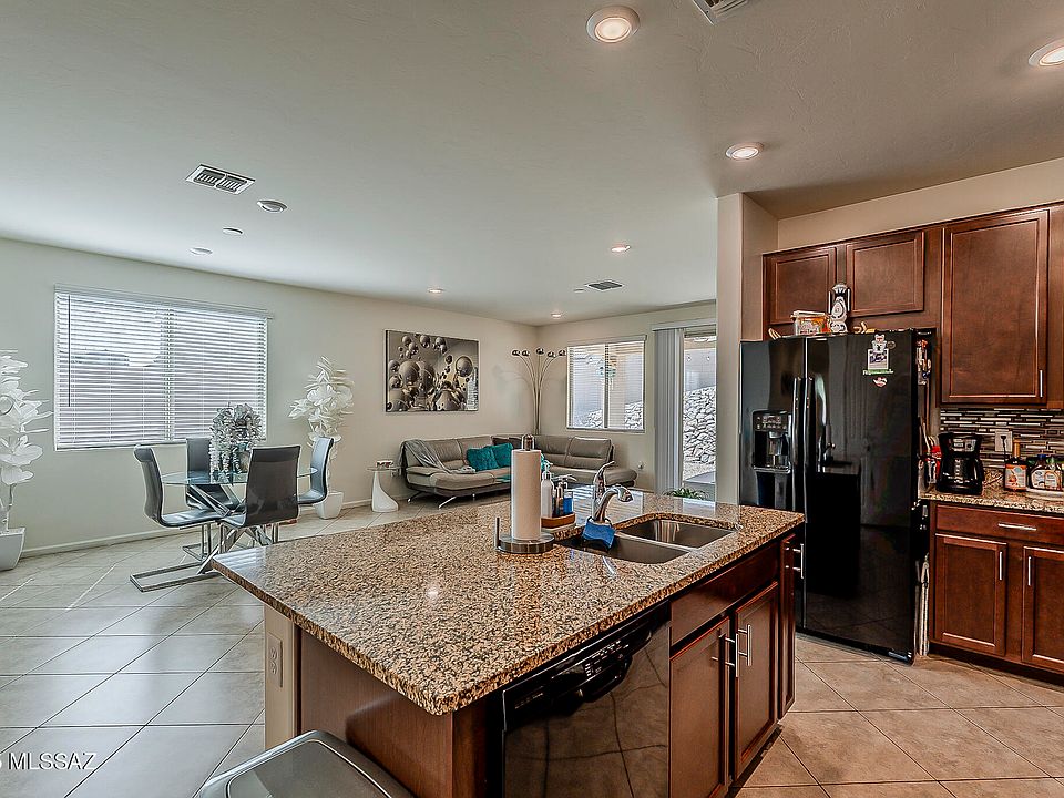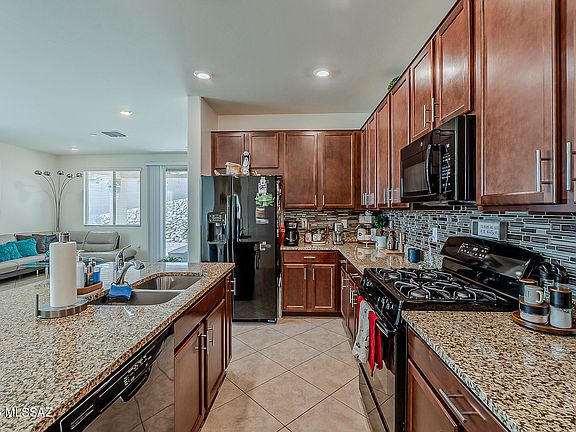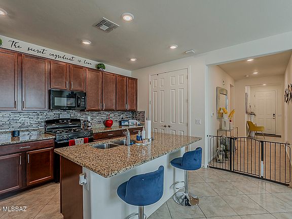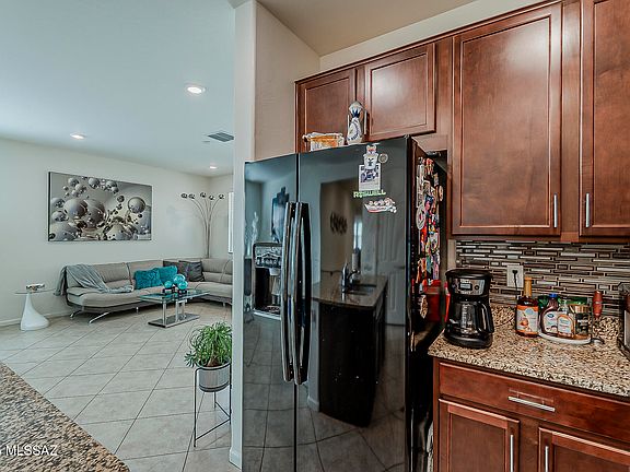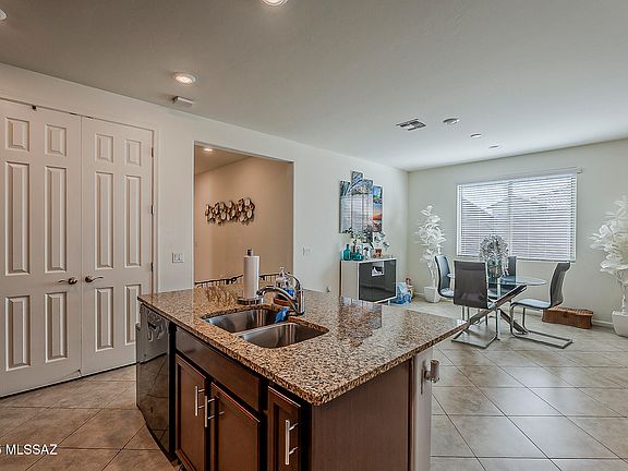 Built in 2019, this 4-bed, 2-bath home in Vail offers energy efficiency and comfort with fully paid-off solar panels and a water softener system. The kitchen boasts granite counters, upgraded tile flooring, 42'' Nutmeg cabinets with crown moulding, and black Energy Star appliances including a refrigerator. Smart home features include Samsung SmartThings Hub, Alexa Echo Show, Echo Dot, Sonos speaker, and Ring Doorbell. Enjoy an extended paver driveway, a double-wide gate for RV/boat storage, and a low-maintenance backyard. Located in a quiet, well-kept community near parks and trails, this move-in ready home is ideal for first-time buyers seeking style, savings, and smart features.