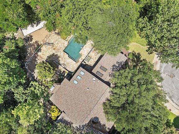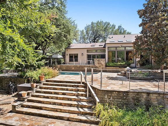 A midcentury modern 4-bedroom, 3 ½-bath 1970s home on a hard to find .62-acre lot that is priced under $1.5 million. Dramatic soaring ceiling with wood beams, a wood-gas stone fireplace and a bank of windows overlook the pool, lighted gazebo, three patios, bocce ball court, built-in outdoor grill, pool and forrested creek lot. Sound system linked to inside and outside. Many improvements have been made to the home including three skylights in the kitchen and a skylight over the live tree in the entrance hall. You will find a whole-house generator, new pool equipment, new water heaters, new hospital grade air filtration systems, new garage door (insulated), Tesla charger, new AC units, gutters with leaf covers and quality lighting. Two master bathrooms and an attic large enough to add another room. A ginkgo tree and two magnolia trees add to the landscaped property. The garage has a built-in workbench with drawers and cabinets and a separate closet. As with many 50-year-old modern homes, you may choose to refresh the design or revel in the dramatic spaces and enjoy the many fine finishes.