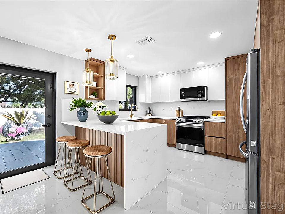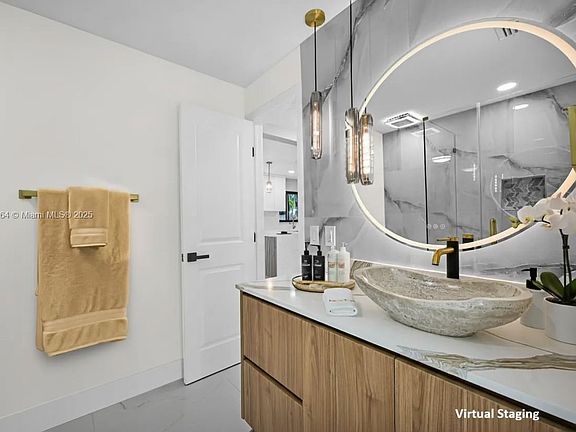 Imagine Sunday mornings in your stunning new kitchen, custom cabinets gleaming as sunlight streams through impact windows onto luxurious porcelain floors. Kids laugh in your private Zen garden while coffee brews. This exquisitely remodeled 5-bed, 3-bath, 2054 sf Hammocks sanctuary is where your story begins. Grandparents thrive in the downstairs suite, a spa retreat with brushed gold fixtures offering total independence. Upstairs, four cozy bedrooms give everyone their own sanctuary. Enjoy dinners under soft recessed lights, then gather in the living room where a gorgeous chandelier casts a magical glow. Walk to A-rated schools, explore lakeside parks, or ice skate on hot Miami days. This Hammocks oasis wraps you in resort-style serenity. Ready to make this luxury beauty your forever home?