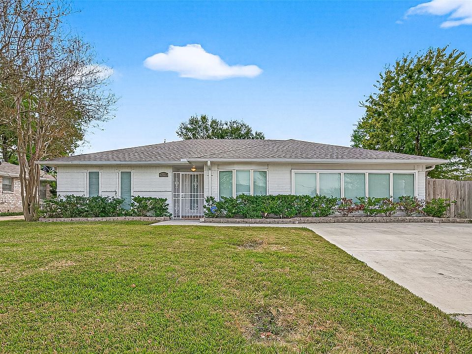 This property features a spacious, open-concept interior with an expansive main living area. The room is finished with wide-plank hardwood flooring in a warm natural tone, extending seamlessly throughout the visible space. The walls and ceiling are new painted crisp white, contributing to a bright and airy atmosphere. Large windows line two sides of the room, allowing abundant natural light to enter and offering clear views of the landscaped exterior. The kitchen is partially visible, separated by a small dividing wall. It features glossy white tile flooring, white cabinetry, and stainless steel appliances, providing a clean and contemporary appearance. Recessed and flush-mounted ceiling lights illuminate the kitchen area. The backyard provides a generous, versatile outdoor space suitable for recreation, gardening, or entertaining.