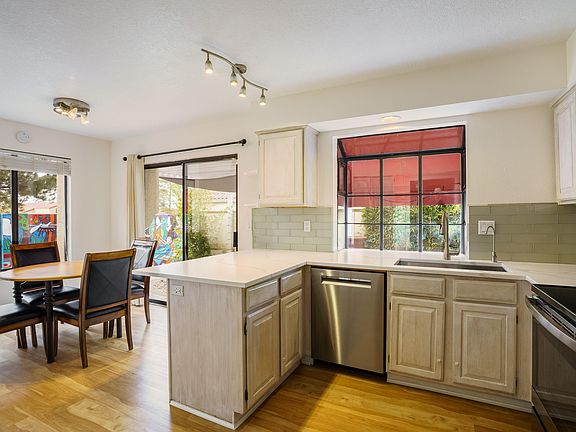 Charming townhome in Academy Ridge with a private front courtyard that wraps around to a potential backyard oasis. The prior owner, an artist, painted a lovely mural in the courtyard. Recent updates include no carpet, a stylish kitchen with backsplash, newer counters, and stainless steel appliances. Enjoy a cozy breakfast nook with walkout to the side yard, vaulted ceilings, and abundant natural light. The spacious primary suite features patio access, a large walk-in closet, and a separate tub & shower. The third possible bedroom could be a great office or extra hobby space. Refrigerated A/C, a utility sink in the garage, and all appliances convey! Call for a showing today.
