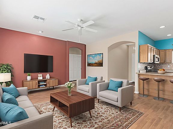 Welcome to Sunland Springs Village, a premier 55+ community where active adult living meets Southwest charm! This beautifully maintained home perfectly captures Arizona living, featuring 2 bedrooms, 2 baths, and an oversized 2-car garage complete with cabinetry, epoxy flooring, and a convenient laundry area. Step inside to discover a bright and inviting interior showcasing southwest color palette, high ceilings, and abundant natural light. With no carpet throughout, you'll appreciate the blend of tile and luxury vinyl plank flooring for both comfort and easy maintenance. The open great room design is ideal for entertaining, while the kitchen offers stainless steel appliances, a refrigerator, recessed lighting, pantry, roll-out shelves, a stunning a stunning copper tile and glass backsplash, and a peninsula breakfast bar for casual dining.