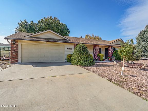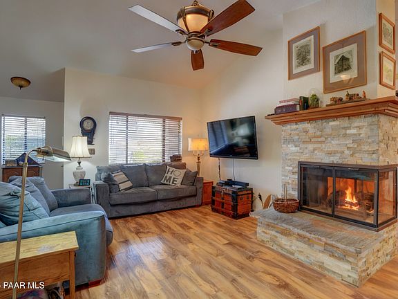 Charming 3 bedroom, 2 bathroom, 1,576 sq ft home in Prescott Country Club! Step into a warm and inviting great room featuring a beautiful stone fireplace. The lovely eat-in kitchen offers plenty of space for everyday dining, and the 180 sq ft heated Arizona room adds year-round versatility. Recent upgrades include new carpet in each bedroom, updated bathrooms, freshly painted interior, and new Arizona Room screens. Enjoy exceptional outdoor living with a flagstone patio and outdoor fireplace--perfect for relaxing or entertaining. You will also find an 8 x 16 greenhouse and a separate backyard building providing 160 sq ft of office space that may also serve as guest accommodations. The 2-car garage includes an additional storage room for tools or hobbies. A wonderful opportunity to enjoy comfortable living in a desirable community!