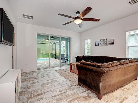 As soon as you enter this home, you'll fall in love with the light rustic wood-look tile flooring. The bright and airy living room is open to the kitchen and dining area, perfect for entertaining. The stunning, modern kitchen features light, solid wood cabinetry, quartz counters, a large island countertop with seating, subway tile backsplash, and slate gray appliances to complete the package. 3 bedrooms, 2 bathrooms, and a office/den provide ample space. The master bedroom is at the back of the home and overlooks the pool area. The master bathroom has dual sinks and Roman shower with light offset tiles. The lanai is the perfect place to relax and entertain with a pocket sliding glass door, large salt water pool with vibrant pavers, preserve and lake view. At Silverleaf, nature is all around with immaculate landscaping and walkable, tree lined streets. Residents can work out, relax, and socialize at the clubhouse with a fitness room, poolside kitchen, and resort-style pool and spa. Silverleaf also includes basketball courts, two dog parks, a playground, and a picnic area with grill. Beautifully located, the community is situated near shopping, dining and entertainment destinations, and convenient to I-75. Don't miss out on this gorgeous home!