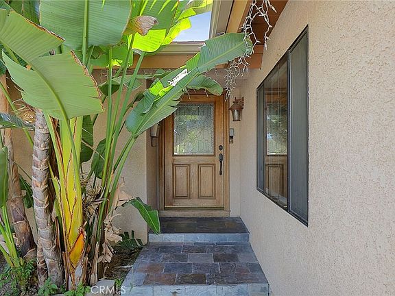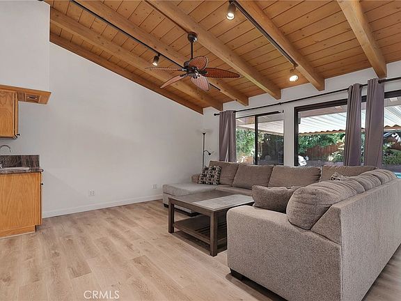 Discover this single-story residence nestled in a sought-after neighborhood, just a short walk from the local school. As you enter through the formal entryway, you’ll be greeted by a spacious living room featuring vaulted beamed ceilings, elegant ceiling fans, and a sophisticated fireplace adorned with a custom granite mantle with built-in shelves and a seamless connection to the dining area create an inviting atmosphere, perfect for both relaxation and entertaining. The bright and airy kitchen boasts generous new countertops, ample cabinetry, and newer appliances, making it a chef’s delight. Adjacent to the kitchen, you'll find a versatile office/work room with walls of built-in desks and cabinets, ideal for productivity or creative pursuits. Each bedroom is enhanced with vaulted ceilings, and the home includes brand-new primary and hallway bathrooms that offer a touch of luxury and comfort. Step outside to the expansive backyard, where a giant covered patio, sparkling pool, cozy firepit, and a large turf area await. Surrounded by mature trees, this outdoor space is perfect for entertaining and enjoying serene moments. Don’t miss the chance to own this lovely home—an exceptional blend of style, function, and pride of ownership!