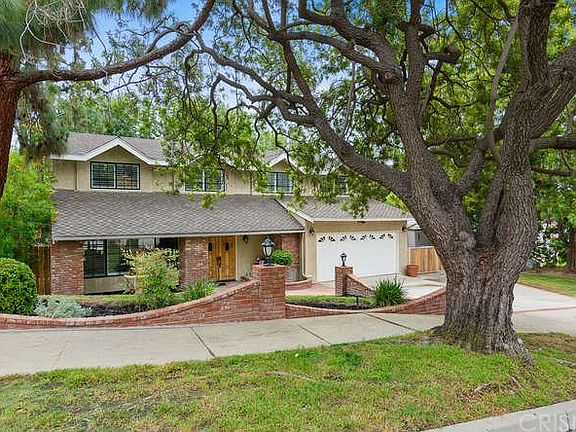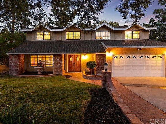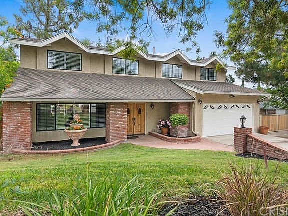 This 16,442-square foot lot is surrounded by 14 pine and other majestic trees, giving the yard the feel of a backyard paradise. The site has hosted a wedding, a wedding reception, sweet sixteen birthday parties, and more end of season team gatherings than the seller can count. An approximately thousand square foot patio is the place to stage your soiree. Guests will enjoy sitting by the outdoor fireplace overlooking the pool and spa or conversing on the side courtyard next to the gentle fountain. Inside, the downstairs has a natural, open flow for entertaining with the kitchen, breakfast area and family room opening to the backyard through two sliding oak French doors. A second area for entertaining can be enjoyed as the living room and formal dining room have access to the side courtyard and back yard through yet another double set of French doors. New white plantation shutters highlight all the windows on the front of the house. A newly refurbished master bedroom features sliding barn doors which open into a finished walk-in closet and master bathroom with new vanities, mirrors, and tile floors. Engineered wood floors and crown moldings grace the two largest bedrooms. The hall bathroom also has a new sliding barn door, new vanity with granite counter and tile floors. Room for RV parking is an option. Walk to Mason Park and enjoy the new Porter Ranch shopping center approximately a mile away. Germain Street Elementary School is close by as is Sierra Canyon School.