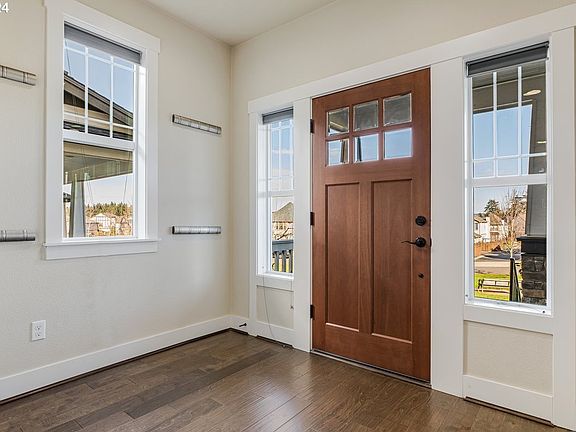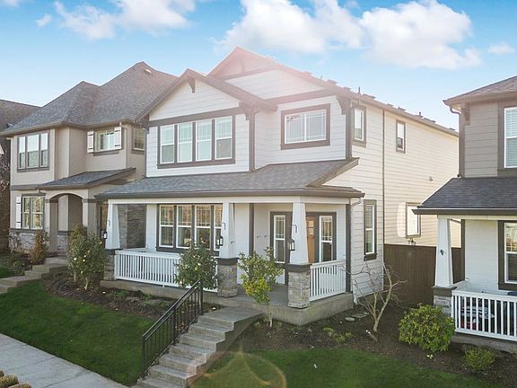 Immerse yourself in the allure of this well-maintained Villebois residence, boasting a partial view of Mount Hood. Situated within a lush green landscape with nearby play structures for children, this home offers easy access to local schools, a neighborhood pool, sports courts, playgrounds, a dog park, and picturesque walking trails. Step inside from the expansive sitting porch into the welcoming open floorplan. Guests will appreciate the upgraded features, including engineered hardwood flooring, a spacious island kitchen with counter seating, and elegant quartz countertops. The kitchen is equipped with stainless steel appliances, including a counter-depth refrigerator. Upstairs, the primary bedroom is bathed in natural light, featuring a generous walk-in closet, a luxurious shower, and a soaking tub, with a convenient laundry room nearby complete with washer and dryer. The second level houses three additional bedrooms and a full bathroom. The 2-car garage offers ample overhead shelving for storage and keypad entry. Enjoy the side patio finished with stone pavers, artificial turf-grass and overhead lighting. This move-in ready treasure is ready for its new owners to enjoy!