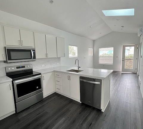 Tucked away at the end of a quiet cul-de-sac, this 2-bedroom, 1-bathroom ADU (Accessory Dwelling Unit) is waiting to be your sanctuary. With 680 sq ft of thoughtfully designed space, it's ideal for both living and working. With a high vaulted ceiling and skylight the open living area is perfect for dining or relaxing. Sip your morning coffee on the private back porch. Walk to nearby shops, restaurants and public transit. Water is included and power is solar-assisted, minimizing your environmental impact and keeping your energy costs low. Quiet heating and air conditioning wall units are located in each room and can be controlled separately. Appliances are included in the unit: washer, dryer, dishwasher, stove/oven, and microwave. Owner/manager lives in the other house on the property. Application fee: $45 Landlord pays for water. Solar panels on the roof to offset the power bill. Permit parking on street only (usually plenty of space). First month, last month and security deposit due at signing. No smoking. Pets considered - contact us for approval process