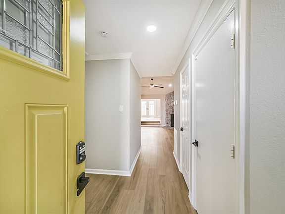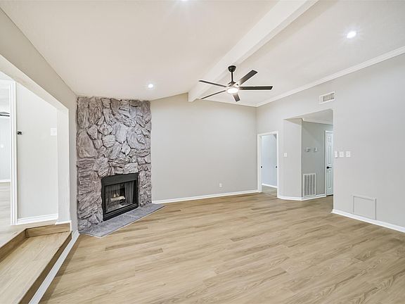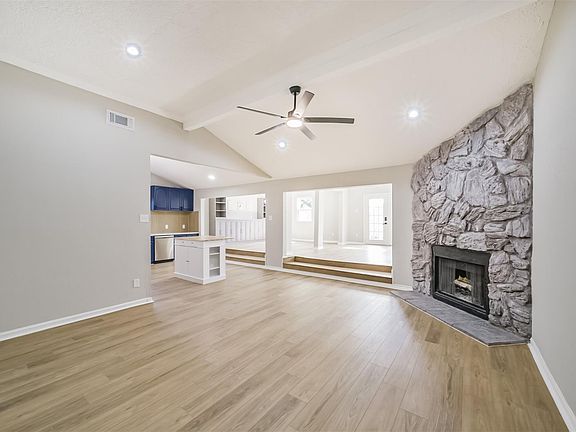 This beautifully remodeled one story blends modern comfort with timeless charm. Fresh paint, new flooring, and thoughtful updates throughout create a warm, move-in ready feel. With over 2,000 sq. ft., this home offers 4 bedrooms, 2 bathrooms, plus a flex space perfect for another bedroom, office or playroom. The tall vaulted ceiling and rock fireplace make a stunning statement, while the split-level layout adds character with steps leading to a separate living area. The island kitchen features stainless appliances, walk-in pantry, and stylish fixtures. Both bathrooms offer high-end finishes and dual sinks. Enjoy double patio doors opening to a backyard retreat with pergola, fenced green space, and plenty of room to relax or entertain. Ready to see it for yourself? Schedule your tour today!