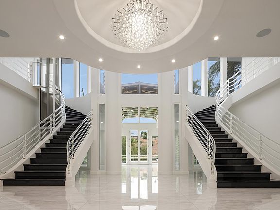 Introducing a truly one-of-a-kind architectural masterpiece nestled in the hills of Chatsworth. This striking modern estate blends bold design with resort-style living, offering sweeping panoramic views and unmatched privacy. A dramatic circular motor court and porte-cochere set the tone for the grand interior, where soaring ceilings, a dual staircase, and walls of glass invite natural light throughout. The expansive open floor plan features multiple living areas, a sleek designer kitchen with dual islands, and seamless indoor-outdoor flow to oversized terraces with stunning canyon and city vistas. Every detail has been curated for luxury, from the private elevator to the elegant fireplace accents and spa-like bathrooms with soaking tubs and scenic views. This fully gated compound also features a state-of-the-art home gym, indoor basketball court, sauna, steam room, home theater, koi pond, and a professional tennis court, all surrounded by lush, mature landscaping. Designed for those who love to entertain and live large, this is not just a home, but an experience. Square footage is as follows: 9,856 SF Living Area and 3,195 SF gym.
