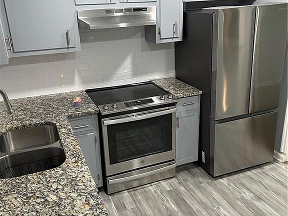 Welcome to this beautifully remodeled property featuring a private entrance and an inviting deck. Step inside to find a bright and spacious living room that seamlessly flows into the modern kitchen, equipped with sleek stainless steel appliances, including a dishwasher, and elegant granite countertops. You'll love the luxury hardwood flooring that extends throughout the entire unit, adding a stylish touch and easy maintenance. Convenience is key with a laundry closet equipped for washer and dryer connections. The property boasts two generously sized bedrooms that share a freshly updated full bathroom, providing easy access from each room.