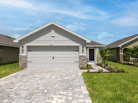$20,000 FLEX CASH INCENTIVE which can be used for Rate Buy Down, Upgrades, Pre-paids + Appliances if closes in 30 days! Estimated payment FHA P&I $1,995.74/Mth. Only $1,000 deposit required, and all closing costs paid (excluding escrow accounts), saving you up to $7,500 with our approved lender! NEW CONSTRUCTION. NO CDD! Desirable Homesite 122 in a new gated community easily accessible from I-95 Exit St. Johns Parkway. This home features a gorgeous paver driveway and stone accents. Enjoy desirable tile in the foyer, great room, kitchen, and baths. Stunning cabinets with crown molding enhance the stainless steel appliances. The owner's suite includes a walk-in closet and a 5' shower in the bath. Additional features include Moen brushed nickel faucets, five-panel doors, and a covered lanai. The community offers a pool with a pavilion. Real estate agents must register buyers at the model home at 1000 Canfield Circle, Palm Bay, FL 32909. Photos are samples; colors and options may vary.