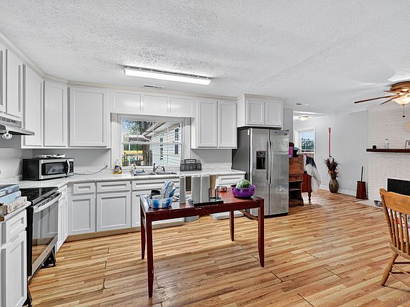 The spacious living room is the heart of the home, anchored by a white brick fireplace that adds warmth and character. A large kitchen offers plenty of workspace and storage, perfect for home-cooked meals or casual get-togethers.