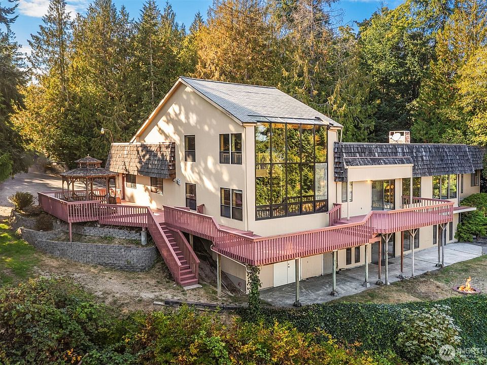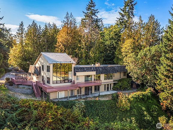 Imagine a spectacular view of the water, high atop Manchester in Port Orchard with stunning year round views of Puget Sound and the downtown Seattle City Skyline. Absolutely stunning. This amazing home offers an incredible opportunity to own a large, multi-generational home where everyone can find a comfortable space to relax and enjoy. There is a full kitchen on the lower level with a bedroom and family room. It is not an approved ADU, but it sure acts like one! Imagine coffee every morning on that deck, looking over Puget Sound at the city lights. And the modern architecture - truly a NW design - authentic. The garage was converted into another extra living area with its own private entry. There are 2 offices. Wanna work from Heaven?