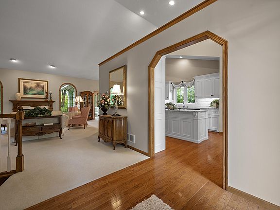 Meticulous custom-built walkout rambler perfectly blends elegance & functionality with 4 bedrooms & 3 baths. Beautifully remodeled kitchen that will inspire your inner chef. The primary suite is a retreat, featuring a spacious bath with separate double soaking tub & shower, perfect for unwinding. The inviting sunroom provides a cozy spot for morning coffee while enjoying serene views of the tranquil wooded cul-de-sac pond lot. The charming brick front adds classic sophistication. Inside, 2 fireplaces create a warm ambiance for family gatherings and cozy evenings. The expansive lower level includes custom built-ins, wet bar, office & plenty of entertaining space. A large unfinished workshop with a separate door to the backyard offers endless project possibilities. The garage features durable polyurea flooring, ensuring a clean, polished look. Experience the perfect blend of luxury & practicality in this exquisite walkout rambler, thoughtfully designed for comfort living.