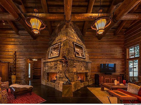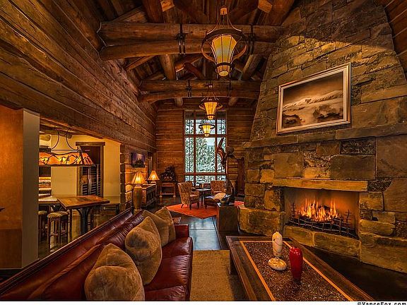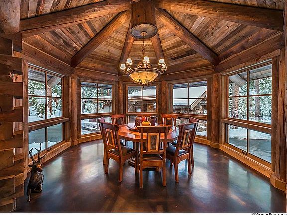 This home sits on a 2-acre wooded lot and is fully log construction. It has two separate structures. The main home is 5,466 sf and has four ensuite bedrooms. It also has a bunk room, which sleeps six and has two full bathrooms. The guest house is 837 sf and has a full kitchen, laundry room, and a bathroom with two private showers, two private toilets, and a trough sink with three faucets.