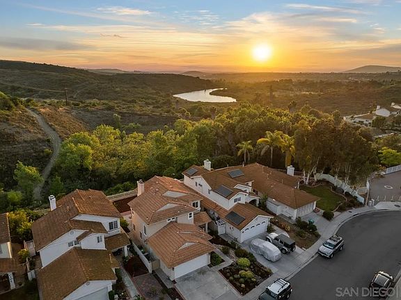 Nestled in the scenic hills of Black Mountain, this meticulously maintained home offers the perfect blend of comfort, style, and thoughtful upgrades. A charming stone walkway and vibrant garden landscaping create an inviting first impression. Step inside to discover an open-concept layout filled with natural light, featuring a cozy fireplace, engineered hardwood flooring upstairs, and a spacious living area ideal for entertaining or relaxing. The kitchen boasts Corian countertops, stainless steel appliances, pendant lighting, a breakfast bar, and vinyl windows and sliders that connect seamlessly to the expansive backyard. Enjoy stunning sunsets from your oversized private outdoor space, designed for low maintenance with freshly installed ground cover and even a flourishing banana tree. Retreat to the vaulted-ceiling primary suite with a walk-in closet and a spa-inspired en-suite bath, complete with quartz countertops, polished stainless steel fixtures, porcelain tile flooring, and a soaking tub. The guest bathroom mirrors the same elegant finishes with a sleek glass walk-in shower. Additional highlights include a welcoming sitting porch, low HOA dues, and access to community amenities like a sparkling pool and children’s play area. Located in the award-winning Poway Unified School District and adjacent to hiking and biking trails, parks, shopping, dining, and freeway access—this home offers the best of San Diego living in a peaceful, well-established neighborhood.